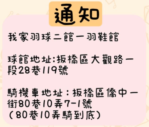 點選下方「確認報名」按鍵後,即代表您將前往:板橋羽鞋,2026-04-26 星期日 14:00 ~ 18:00的場地。