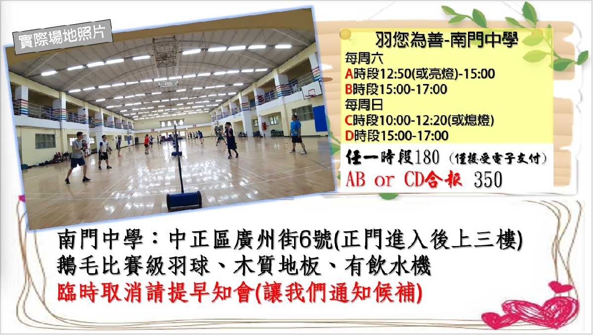 點選下方「確認報名」按鍵後,即代表您將前往:南門國中,2026-04-25 星期六 15:00 ~ 17:00的場地。