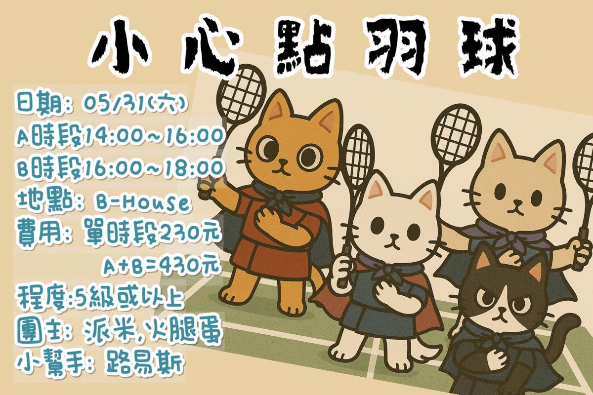 點選下方「確認報名」按鍵後,即代表您將前往:B house羽球窩,2025-05-31 星期六 14:00 ~ 18:00的場地。