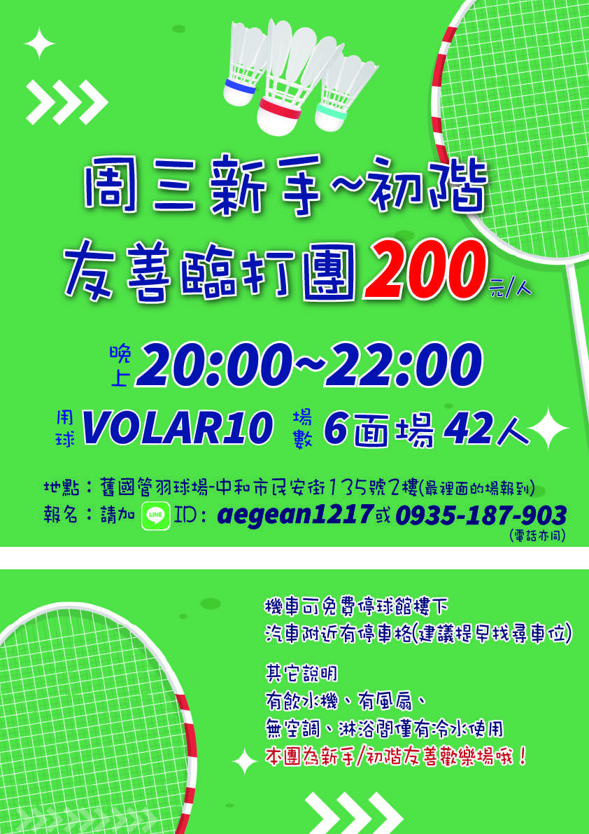 點選下方「確認報名」按鍵後,即代表您將前往:舊國管羽球場(中和區公所羽球館),2026-05-06 星期三 20:00 ~ 22:00的場地。
