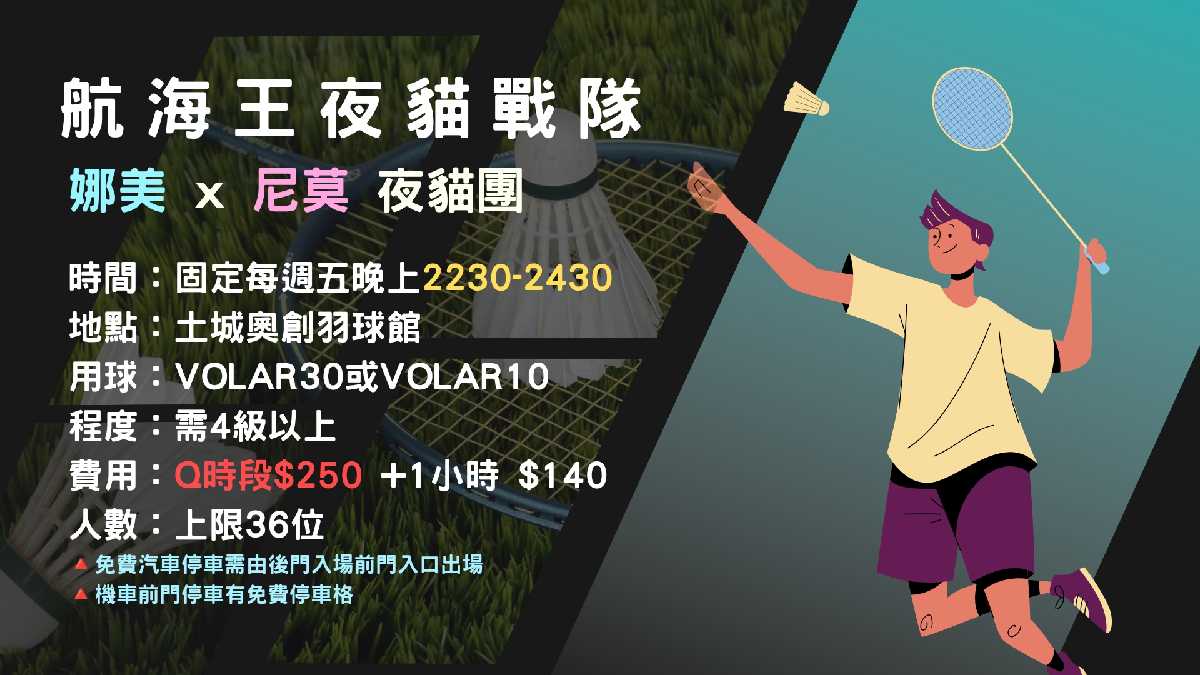 點選下方「確認報名」按鍵後,即代表您將前往:奧創羽球土城館,2026-04-24 星期五 22:30 ~ 24:30的場地。