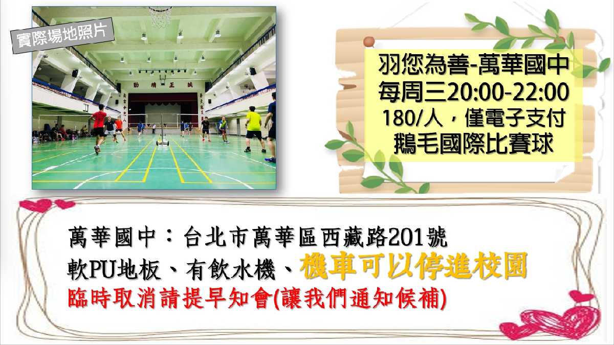 點選下方「確認報名」按鍵後,即代表您將前往:萬華國中,2026-04-29 星期三 20:00 ~ 22:00的場地。