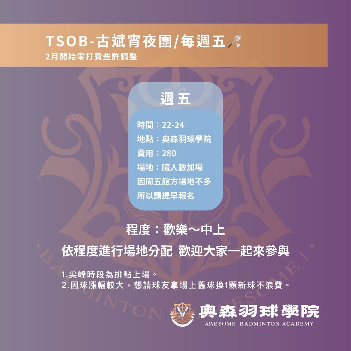點選下方「確認報名」按鍵後,即代表您將前往:奧森羽球學院,2026-04-24 星期五 22:00 ~ 00:00的場地。