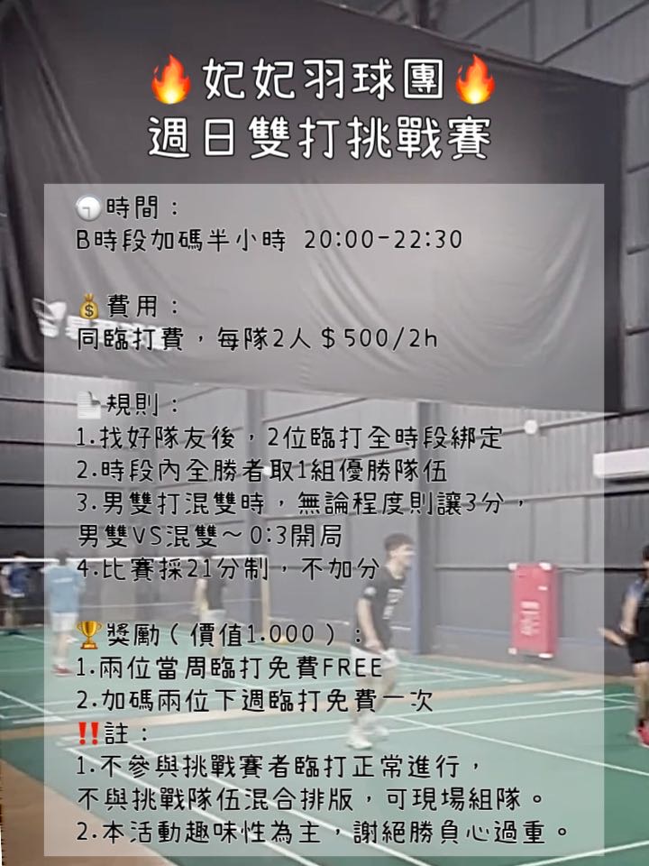 點選下方「確認報名」按鍵後,即代表您將前往:易羽球館,2026-04-26 星期日 18:00 ~ 22:00的場地。