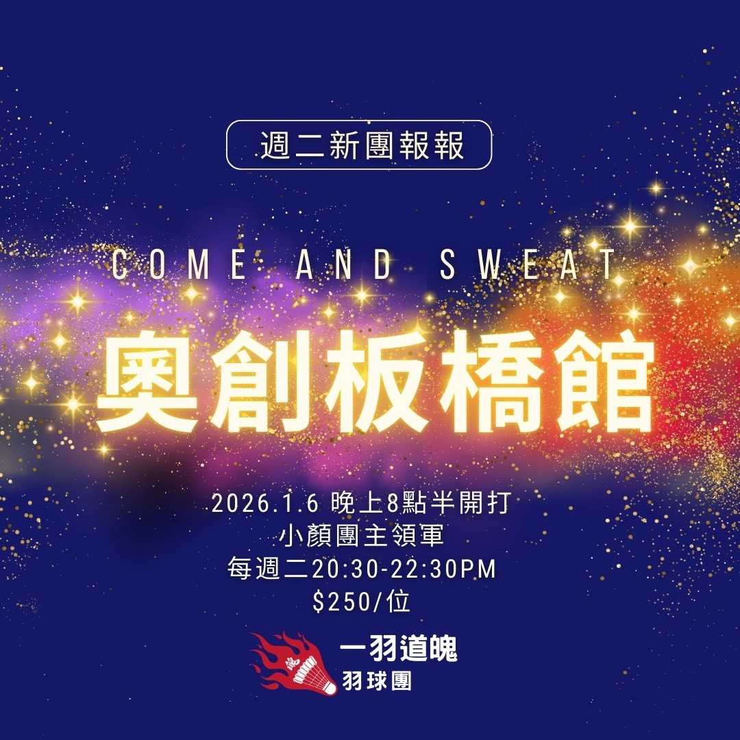 點選下方「確認報名」按鍵後,即代表您將前往:奧創板橋館,2026-04-28 星期二 20:30 ~ 22:45的場地。