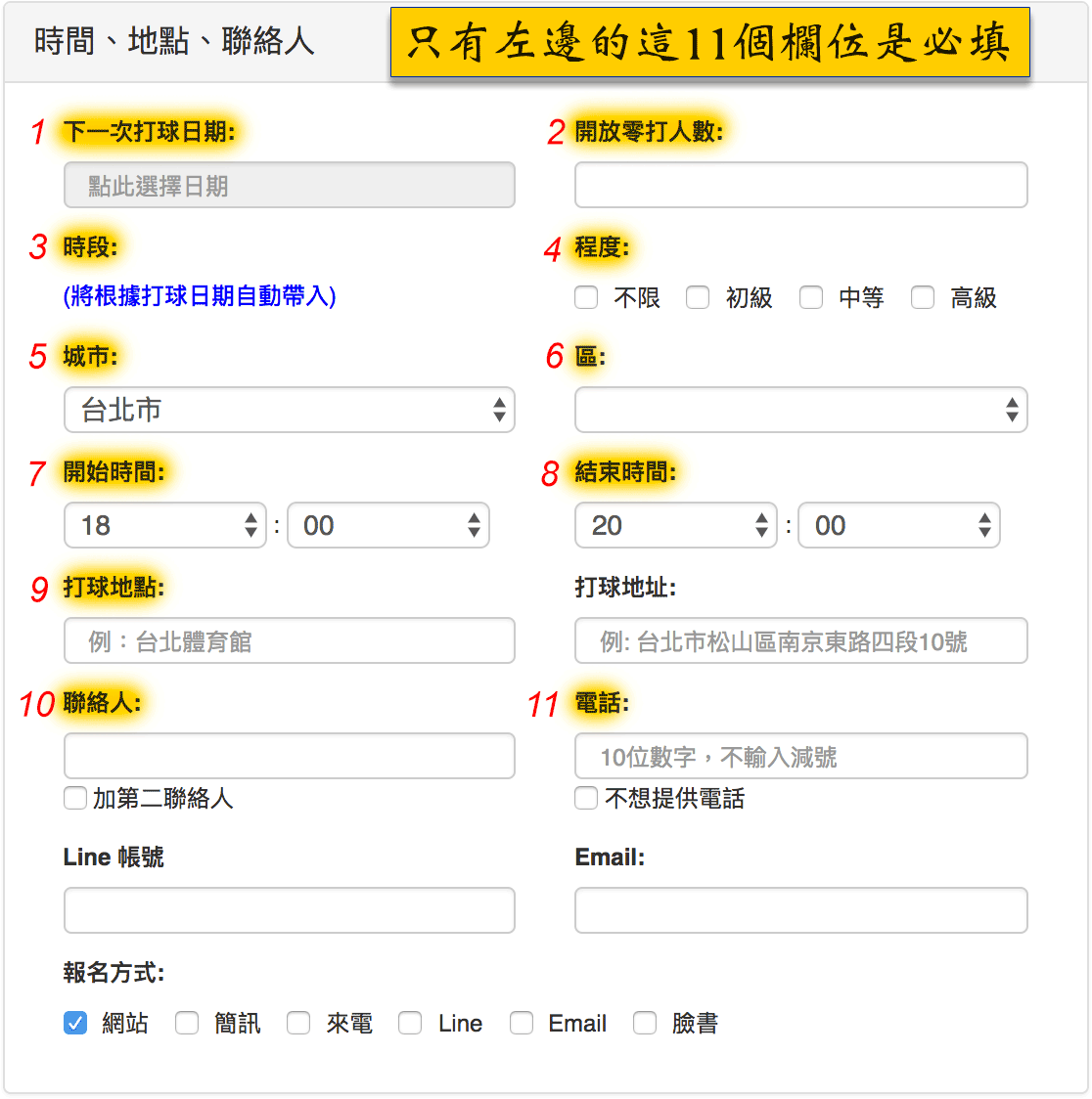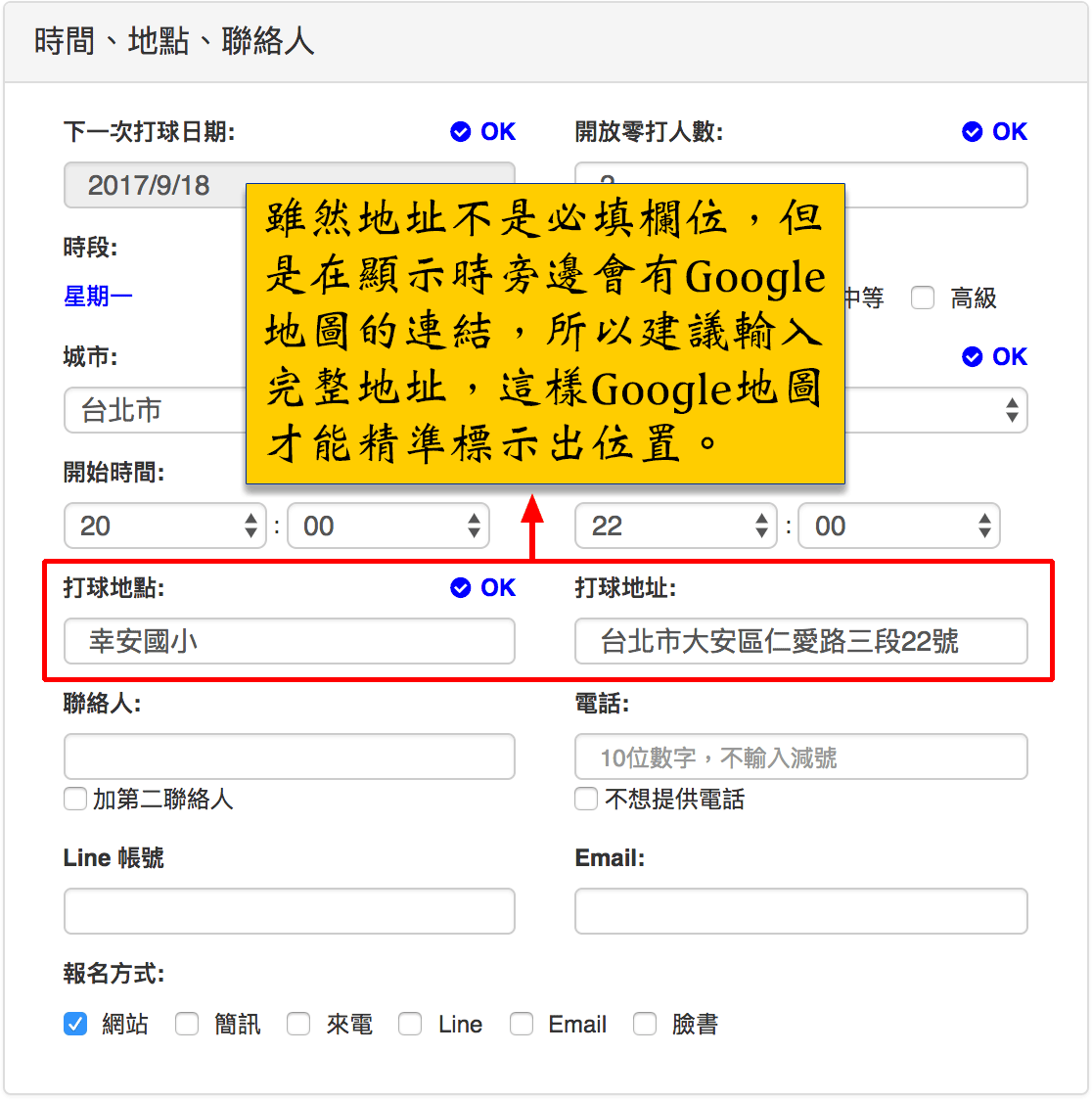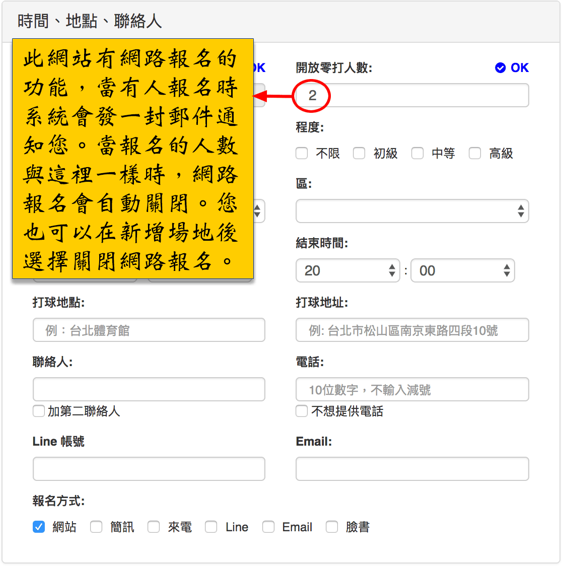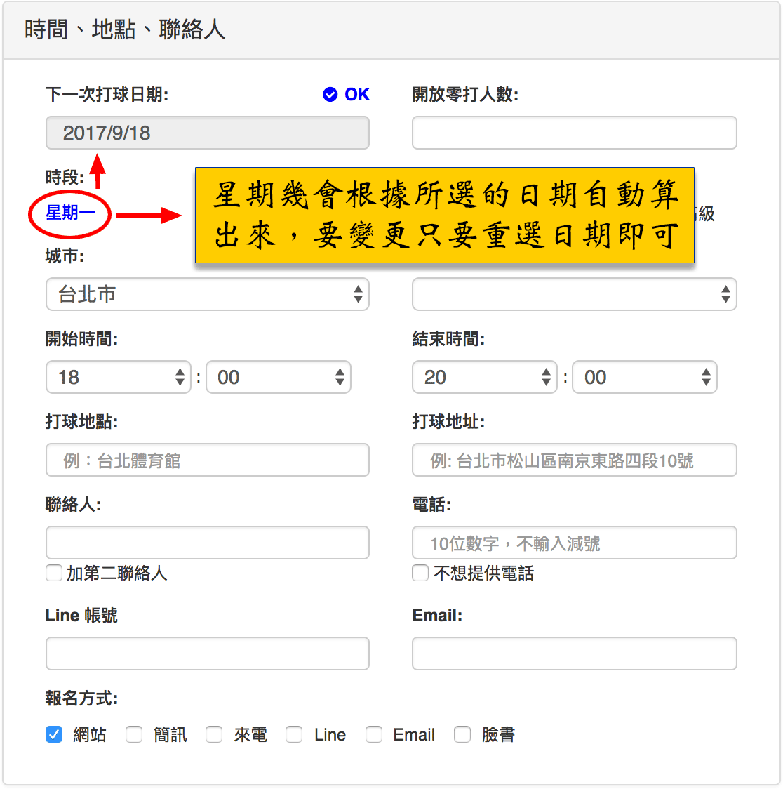 場地請新增一次就好。如果您的場地每個星期都有零打名額,請每個星期來更新 (