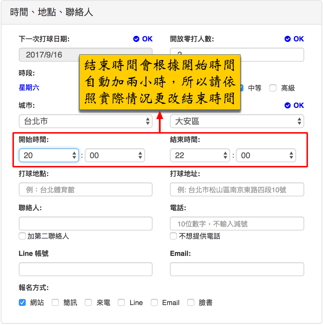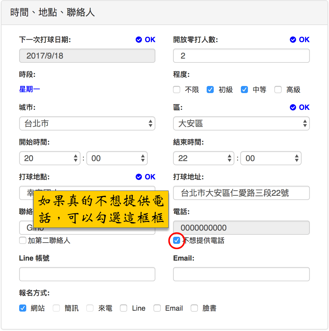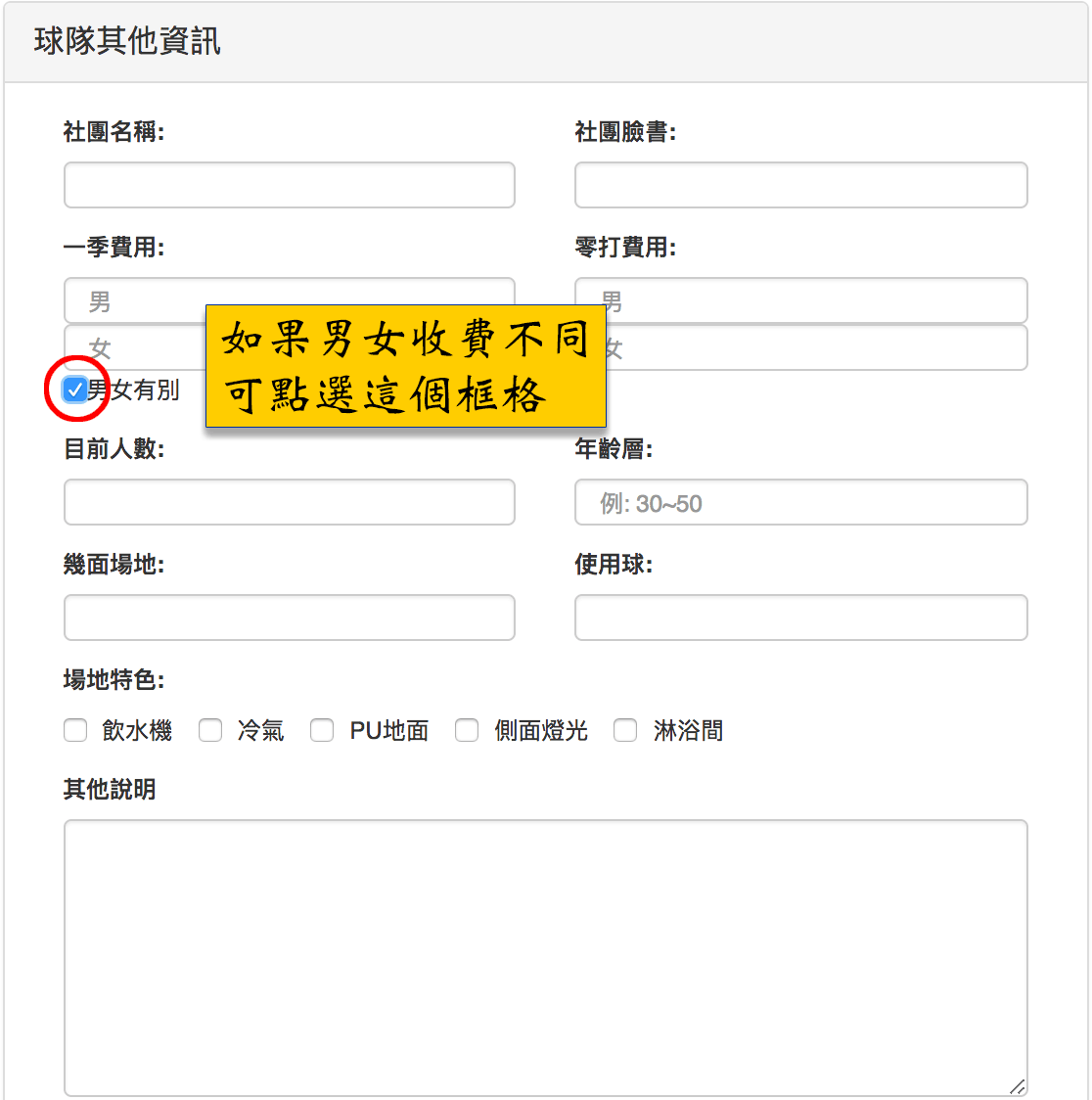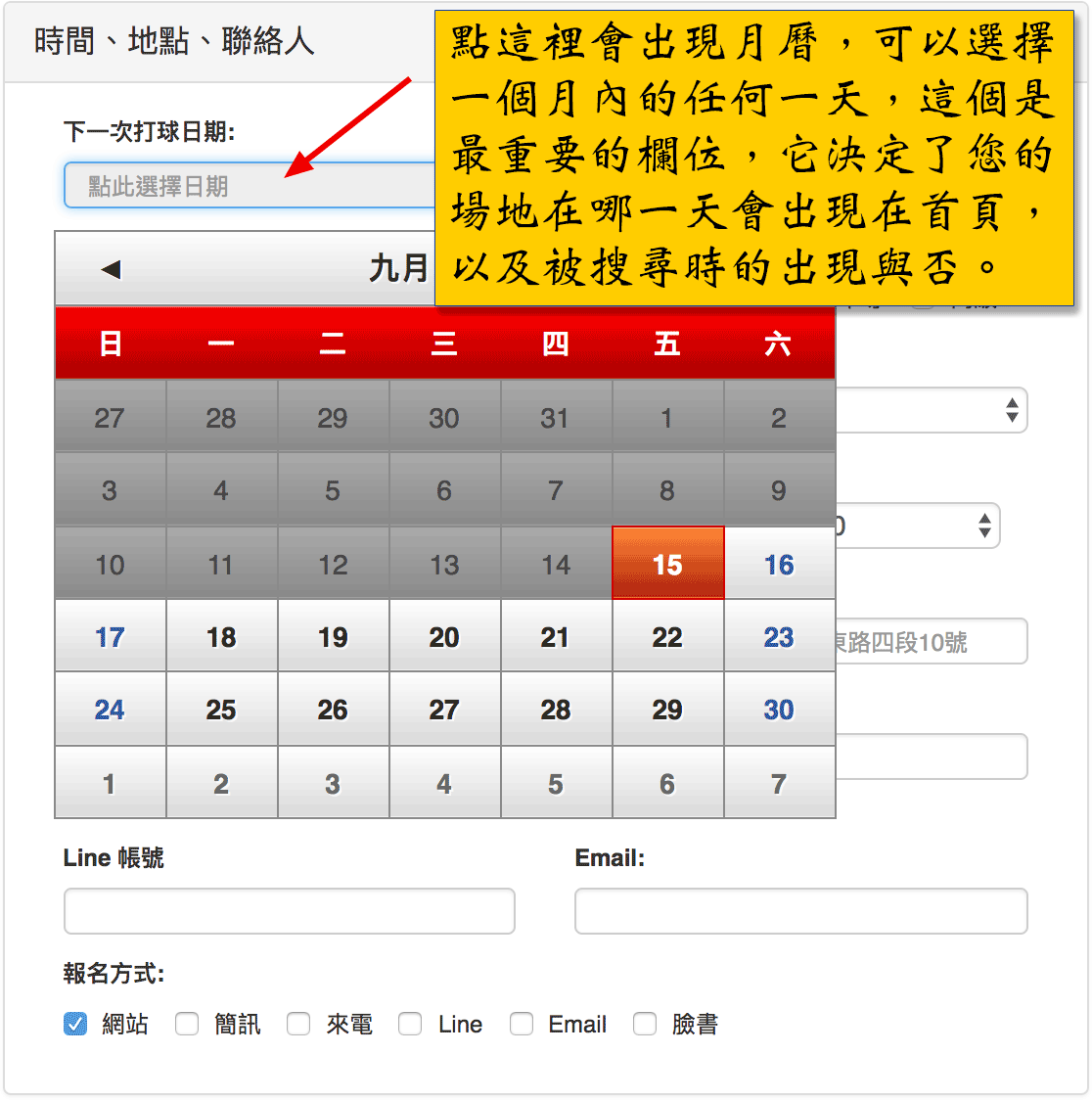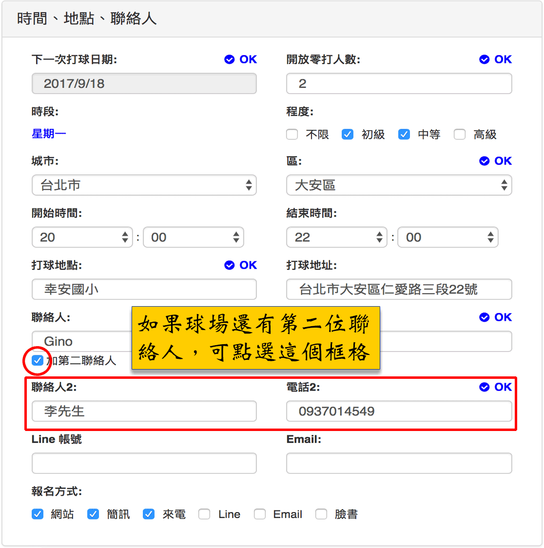 場地請新增一次就好。如果您的場地每個星期都有零打名額,請每個星期來更新 (