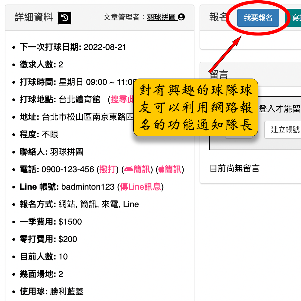 球友可以在瀏覽球隊資料後直接在網站或羽球拼圖APP進行報名。