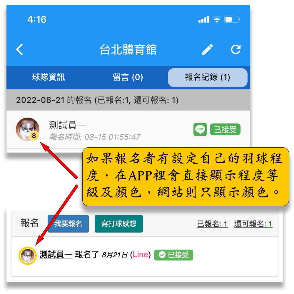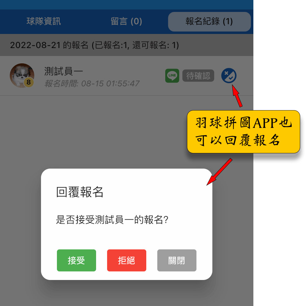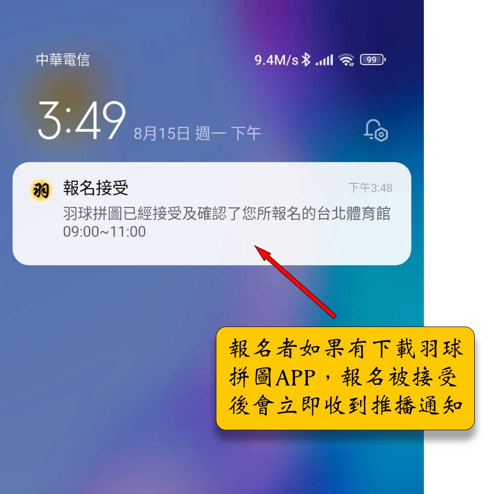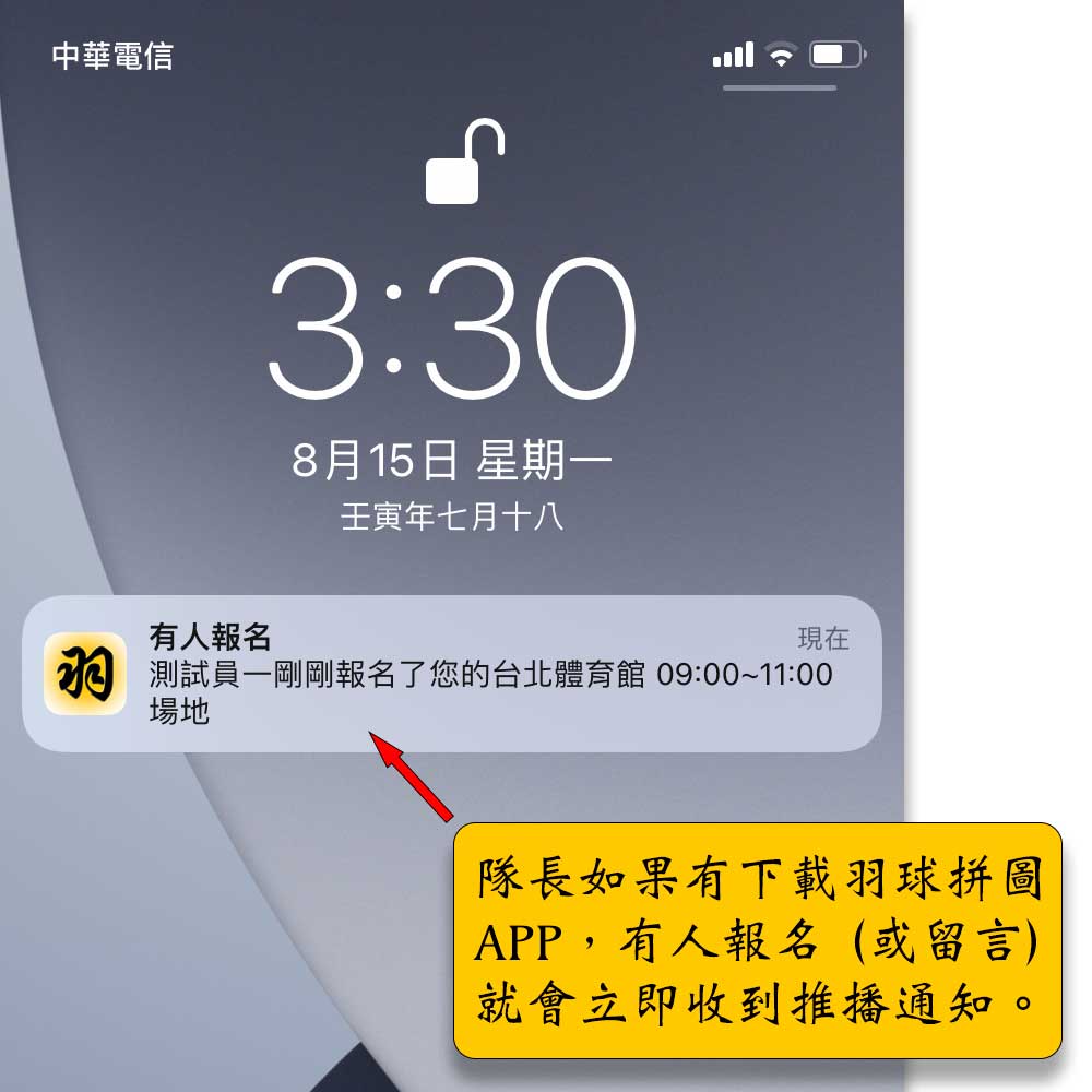 - 隊長和報名者需要下載,登入羽球拼圖APP後才會收到手機推播通知。