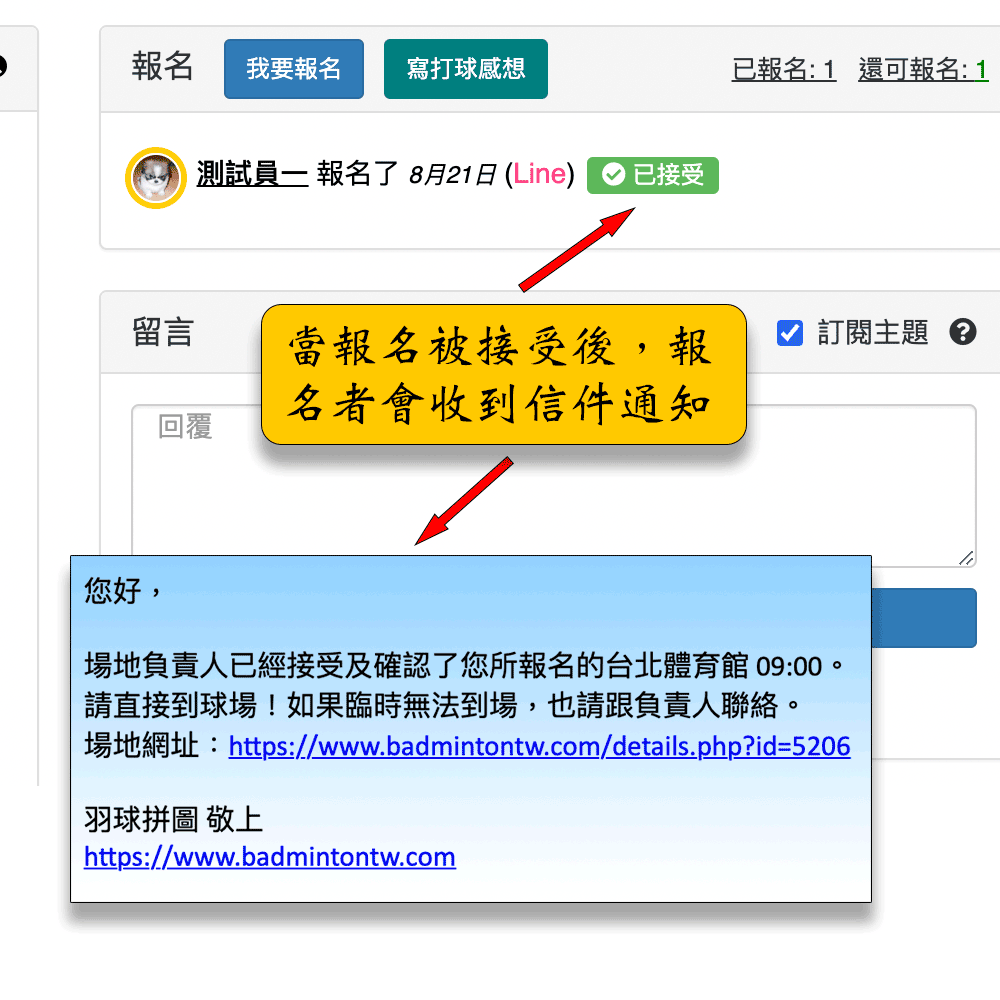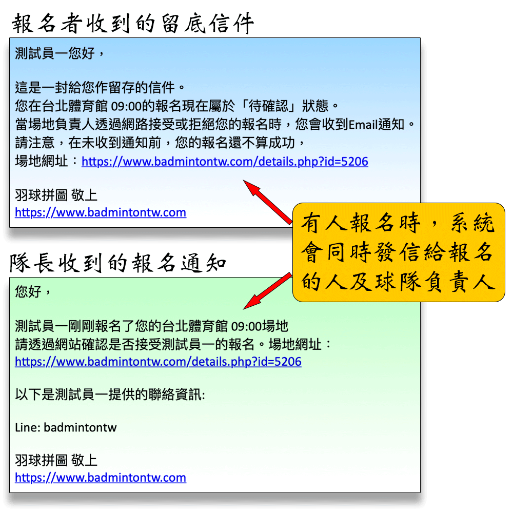 - 通知方式為兩種,Email通知及APP推播通知(如果隊長有下載羽球拼圖APP的話)。