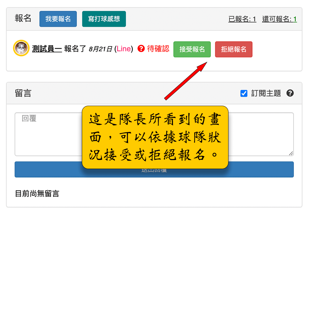 - 有人報名後系統會通知球隊負責人,負責人可以接受或拒絕報名。